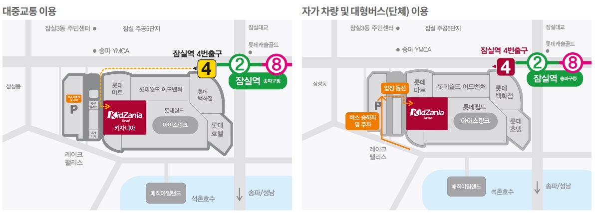 카카오내비 검색 "키자니아 서울", "롯데월드 옥외주차장"
